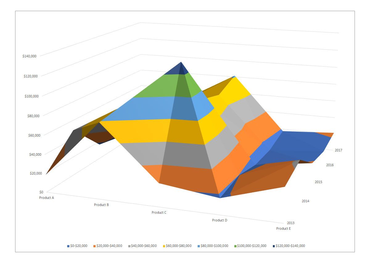 برای نمایش داده درزمینهی سهبعدی میتوان از نمودار سطحی استفاده کرد. رسم این نوع از نمودار در اکسل که